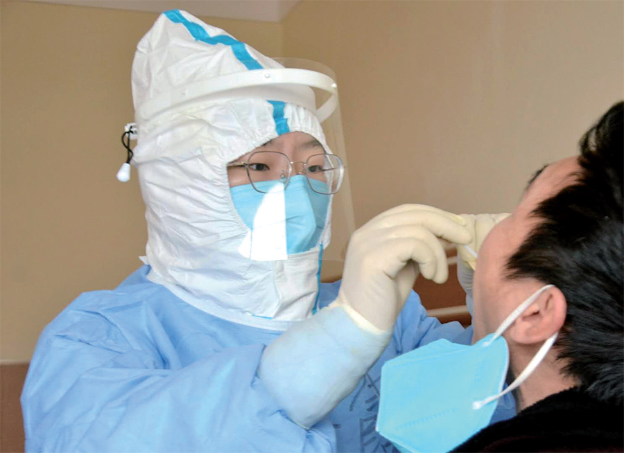 商春霞在采集患者的咽拭子標本。(圖片由示范區(qū)婦聯(lián)提供)