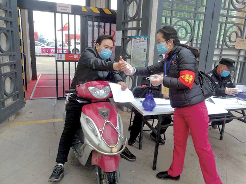 濟水苑社區(qū)志愿者對出入社區(qū)的居民進行體溫測量、酒精消毒。(圖片由示范區(qū)婦聯(lián)提供)