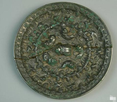 海獸葡萄紋銅鏡是唐代最具特色的新鏡類,它揭開(kāi)了唐代鏡主題紋飾的序幕,流行在唐高宗、武則天時(shí)期,其形制主要為圓形,少量呈方形、菱花形。鏡背紋飾系高浮雕,主體紋飾由四五個(gè)海獸和葡萄枝蔓組成。