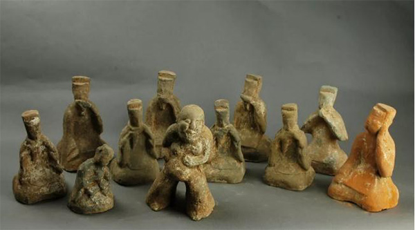 漢代,2006年4月出土于軹城鎮(zhèn)嶺頭村,共有11件神情各異、栩栩如生的人物雕塑,他們或演奏,或觀賞。其中吹蕭俑7個(gè),吹塤俑1個(gè),聽(tīng)樂(lè)俑1個(gè),俳優(yōu)俑1個(gè),抱孩俑1個(gè)。