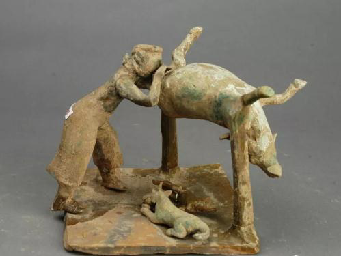 該器物由一人一獸二狗和一架子構(gòu)成,生動(dòng)再現(xiàn)了兩漢時(shí)期宰殺牲畜的場(chǎng)面,真實(shí)自然,人物、動(dòng)物刻畫(huà)逼真、生動(dòng)。畫(huà)面中,往死后的動(dòng)物腹內(nèi)吹氣的目的是便于刮毛,這種方法在很多農(nóng)村地區(qū)仍然沿用。
