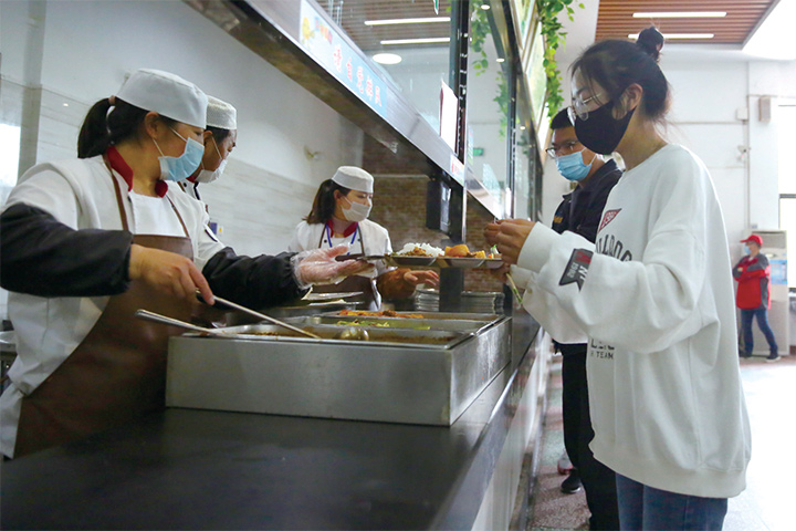 各高中對學(xué)生在校期間的營養(yǎng)很重視。為了避免學(xué)生因選擇飯菜而產(chǎn)生人員接觸,全部窗口改為統(tǒng)一定價(jià)套餐,保證每天菜品不同,營養(yǎng)均衡。為實(shí)現(xiàn)就餐一人一桌,濟(jì)源四中還將兩個(gè)車棚改造成臨時(shí)餐廳。