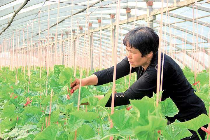 連日來(lái),天氣晴好,菜農(nóng)搶抓時(shí)機(jī)給黃瓜“吊秧”,促進(jìn)其生長(zhǎng)。記者劉培琳攝