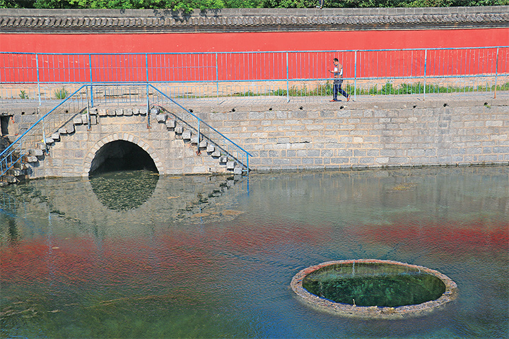 20世紀(jì)70年代興修水利工程,人工石砌了正方形珍珠泉池(邊長(zhǎng)約25米、深約3.8米)。目前,池中間一股大泉涌流,池底水珠天然、串串外冒,西邊承接濟(jì)瀆廟院內(nèi)小北海的出水。池內(nèi)涌泉突水后蜿蜒東流,入濟(jì)水古道。