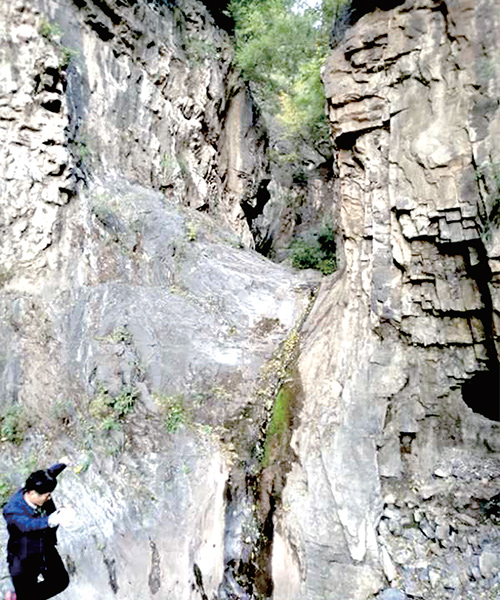 濟(jì)源克井鎮(zhèn)交地村天井寺東北角入兩山之谷,沿交地古道,峰回路轉(zhuǎn)攀行狹窄山路約1.5 公里,途經(jīng)左山崖下天然石洞茶水店、谷中翹峰龍王廟,至右山柔彎里到達(dá)泉洞。