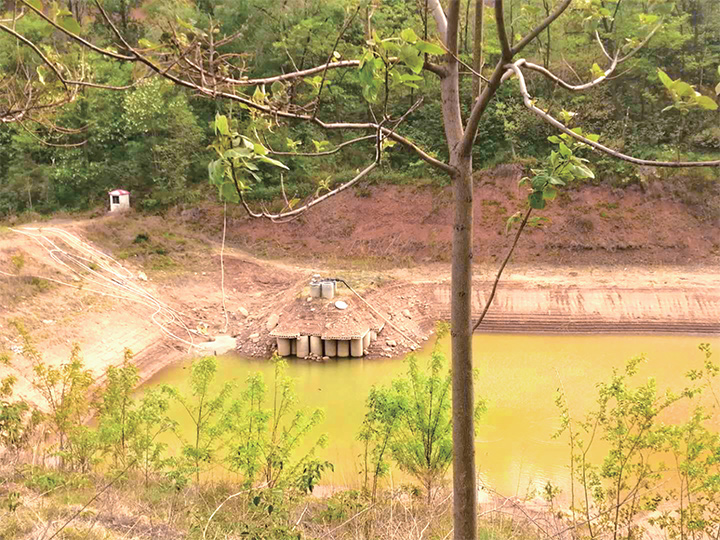 泉坑由南、西、北三面高坡圍成。西坡腳下有一股大泉噴涌;北坡半腰有兩股泉眼直流。泉水原來是張凹村居民生活飲用和灌溉之水源。泉水在豐水期大、旱季小,至今尚在流淌。2018年整修泉坑為水庫。水庫為不規(guī)則方形,占地4畝,庫深6米,豐水位4.5米。庫水經泵抽用于200多畝山地的灌溉。