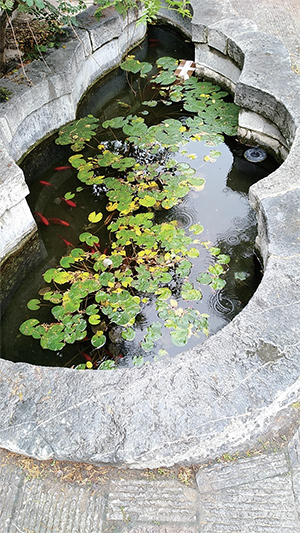 院內(nèi)西臺(tái)階處有一青石龍頭口吐甘潤(rùn),伏流三、四米至秋葉池出,常年不涸,又潛流出寺外。