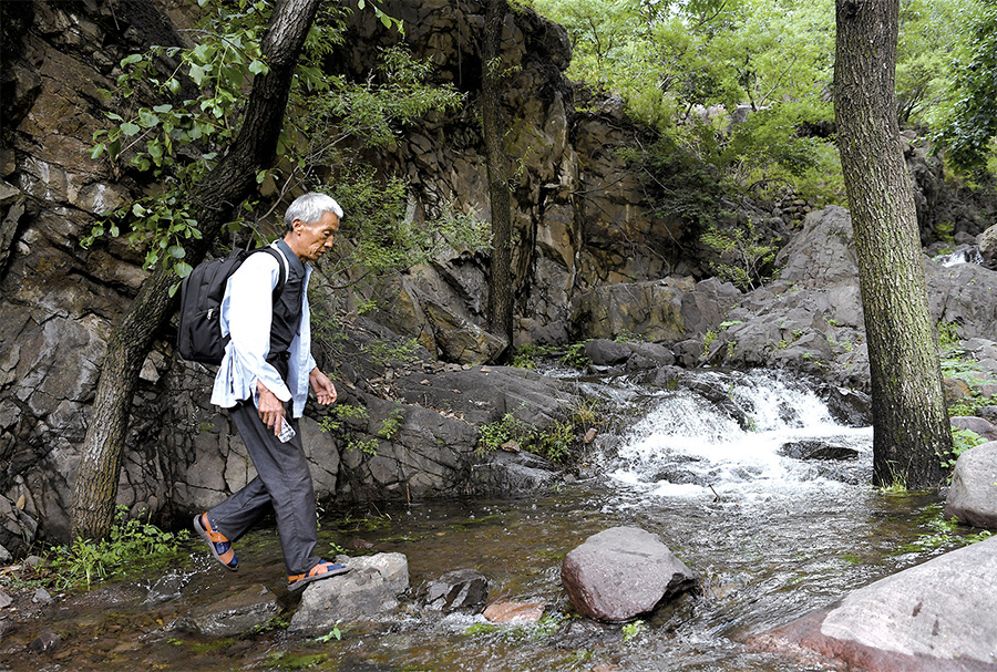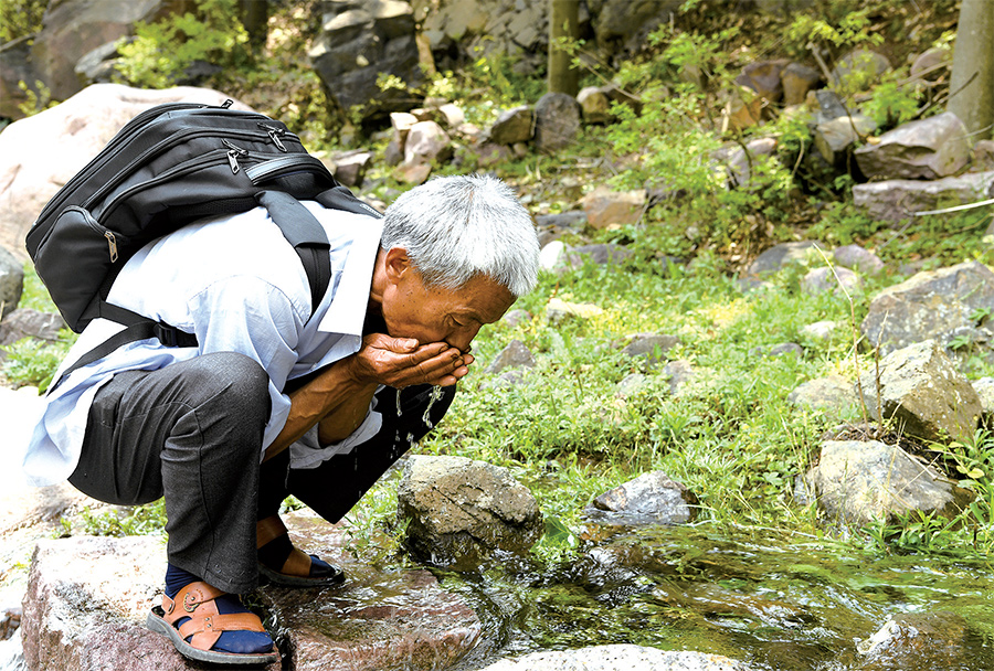 6月18日,王法團在巡山途中的小溪旁飲水。