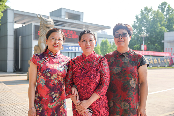 為了給孩子加油打氣,不少家長在著裝上下了功夫。在送考家長隊(duì)伍中,紅色是主色調(diào),爸爸們穿紅色T恤,媽媽們則選擇了紅色旗袍、紅色連衣裙。一位“旗袍媽媽”笑言,這是為“取個(gè)好寓意,希望孩子們考試能紅紅火火、旗開得勝”。