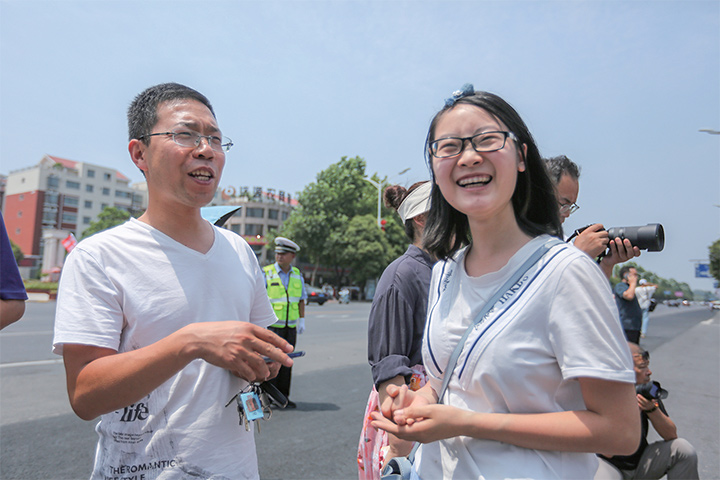 嘴上說著不激動(dòng),但是當(dāng)手表上的時(shí)間顯示再有10分鐘上午的考試就結(jié)束的時(shí)候,李阿姨還是忍不住從馬路牙子上站了起來,站到警戒線旁,急切地望向大門,仿佛下一秒就能看見女兒熟悉的身影。在她身后,原本坐在樹蔭下乘涼的家長們也聚攏過來,與她一起伸著脖子望向考點(diǎn)大門。