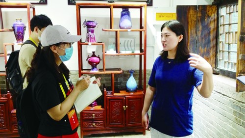 在鈞瓷的故鄉(xiāng)河南禹州神垕鎮(zhèn)的古街上,武雙珂(右一)講述她的創(chuàng)業(yè)故事。