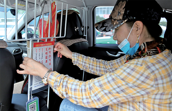 7月13日,出租車從業(yè)人員正在車內(nèi)張貼公益廣告。