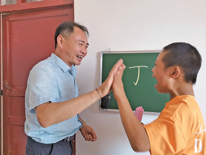 “m-a-ma,ma-ma!來,用你的小手感受老師的聲音。”孔建設(shè)一手拉著孩子的手放在自己的咽喉處,一手指著自己的嘴,讓孩子模仿自己的口型發(fā)音。這種也許我們在特殊學(xué)校才能看到的場景,就發(fā)生在丁書雷家里。由于智力有障礙,丁書雷無法入校隨讀。為培養(yǎng)孩子基本的溝通能力,孔建設(shè)帶領(lǐng)老師定期到丁書雷家里開展送教上門活動。“孔校長每次來都給孩子帶上一些零食、文具、衣服,孩子可喜歡他了?!倍椎膵寢尭嬖V記者,上了幾次課后,丁書雷慢慢能認(rèn)準(zhǔn)掛圖上的畫了。