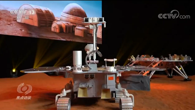 劉彤杰:“著陸平臺(tái)也叫著陸器,它和火星車加起來(lái)是1300公斤,著陸平臺(tái)載著火星車要完成進(jìn)入大氣、減速、下降、落在火星表面上,這是它最大的使命?!?/p>