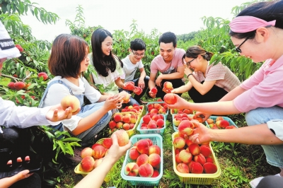 圖為游客在光山縣椿樹崗村世旺生態(tài)園采摘胭脂脆桃(7月26日攝)。謝萬柏攝