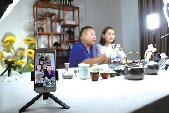 晚上8點,在中國白銀城網絡直播孵化基地,“90后”主播高清源打開手機里的直播軟件,面對手機做直播練習。她一邊試戴各種銀類飾品,一邊描述著試戴體驗。身邊指導她的師傅李亮則不時把商品鏈接放入直播間小店。
