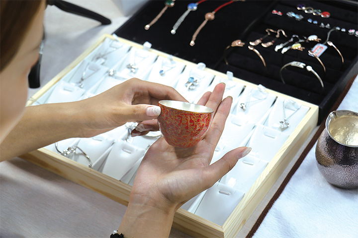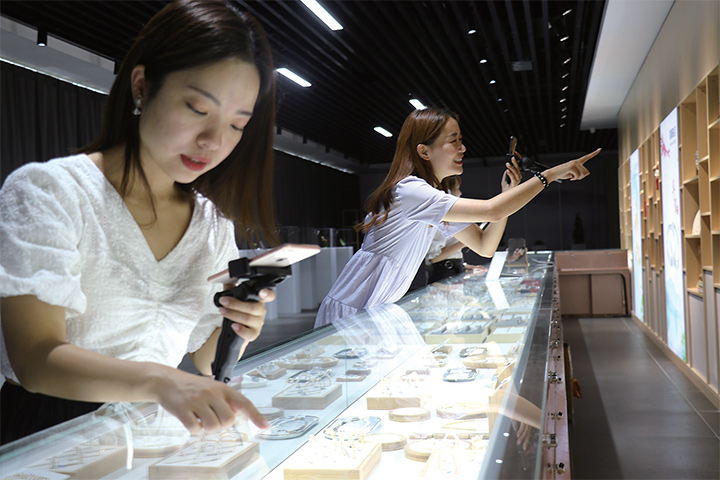 7月27日,高清源(右)和同事在展柜直播賣貨