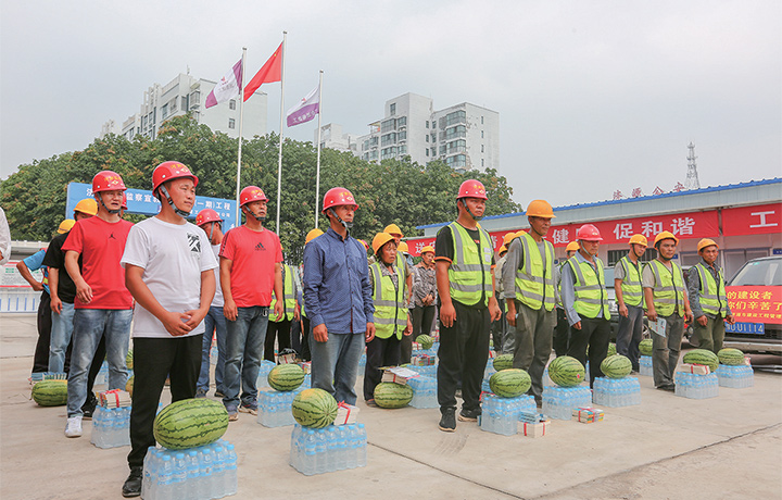 在濟(jì)源紀(jì)檢監(jiān)察宣教基地項(xiàng)目施工現(xiàn)場(chǎng),西瓜、礦泉水、風(fēng)油精等防暑物品整齊擺放,農(nóng)民工們有序領(lǐng)取了降溫物品,臉上露出了感動(dòng)的笑容。