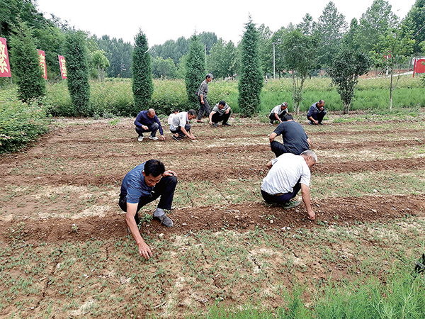 范哲紅帶領(lǐng)村干部和黨員在苗圃除草
