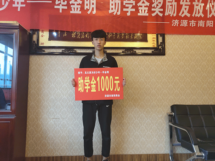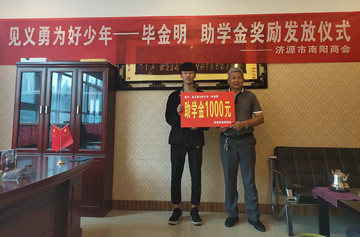 濟源市南陽商會為“見義勇為好少年”畢金明頒發(fā)助學金