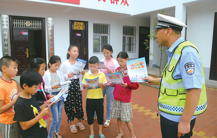 目前正值暑假,濟(jì)源交管部門工作人員走進(jìn)鄉(xiāng)村,宣傳“一人一帶”的交通安全知識,增強(qiáng)人們的安全出行意識。記者 李浩 攝
