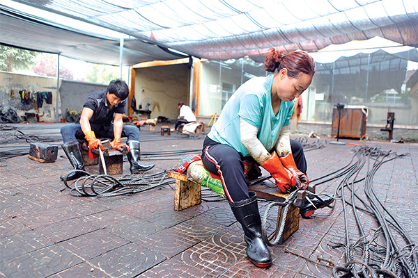 村民在鋼絲繩索具加工基地認真工作。劉培琳 攝