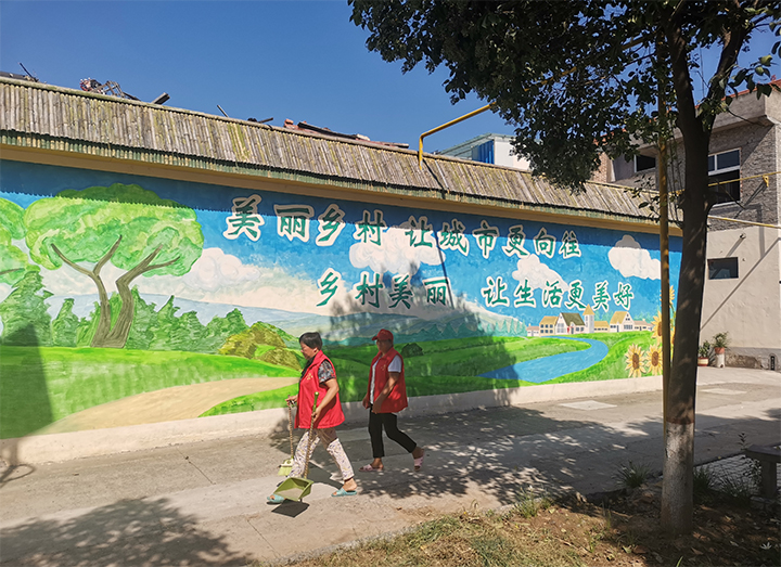 視線越過游園,入村道路寬闊平整,兩側(cè)栽種著綠化苗木。一排排房舍白墻灰瓦,沿街墻面上繪著家庭美德、社會(huì)公德、個(gè)人品德、職業(yè)道德等各種宣傳畫。街邊不時(shí)有村民走過,步履輕松且從容。