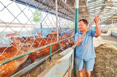 9月16日,鶴壁市上峪鄉(xiāng)鹿廠村梅花鹿生態(tài)養(yǎng)殖扶貧基地,工人正在投喂草料。該基地通過(guò)金融扶貧貸款開(kāi)展梅花鹿特色養(yǎng)殖,兩年多來(lái),已帶動(dòng)了14個(gè)村的315戶(hù)貧困戶(hù)增收。記者 聶冬晗 攝