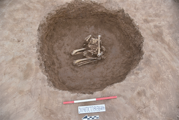 2020年4月,在濟源柴莊遺址的發(fā)掘過程中,考古人員發(fā)現(xiàn)了罕見的“坎”字形人祭坑。人祭遺存身首異處,面朝北方,雙膝跪于坑內(nèi),兩手交叉放在身前,保存較為完整。