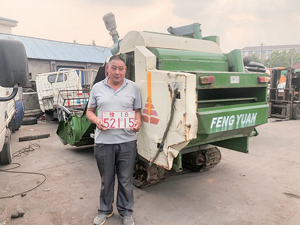 王久常領(lǐng)取到報廢補(bǔ)貼金后和報廢收割機(jī)合影留念