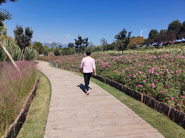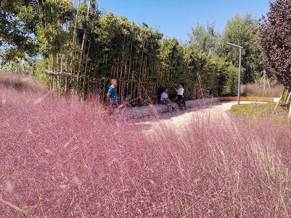 沿著環(huán)湖步道一路向西,花海廣場(chǎng)呈現(xiàn)在眼前。隨手一拍即是畫,連片成海的粉黛亂子草、紅黃相間的月季,吸引著徜徉在花海的游客紛紛拍照留念。