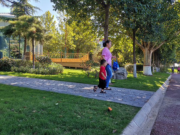 秋天的午后陽光,照亮了萬陽湖畔波光粼粼的水面。吃過午飯,盧賽賽帶著孩子來到萬陽湖畔的諧園游玩,她們漫步在萬陽湖畔,享受著遠(yuǎn)離塵囂的愜意和悠閑。