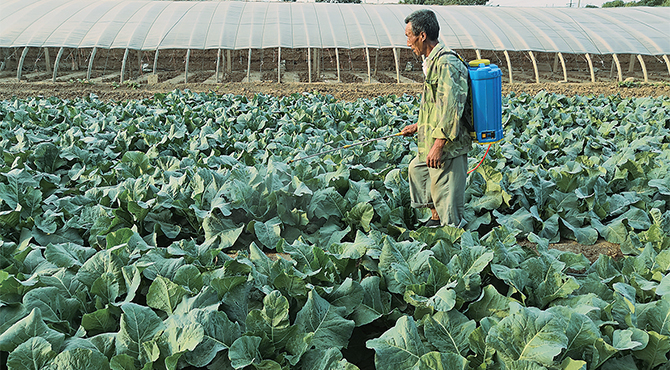 日前,在軹城鎮(zhèn)中王村,菜農(nóng)在花菜地里噴藥。