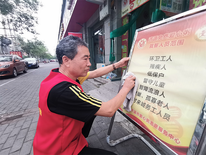 李宣莊擦拭愛心粥就餐人員標(biāo)識牌