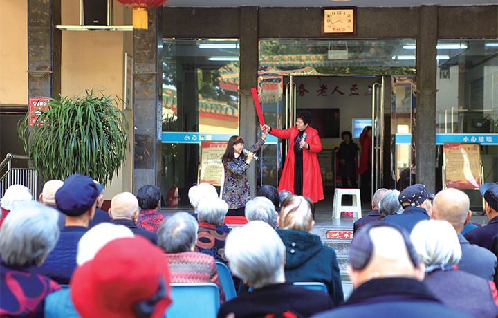10月18日,文藝志愿者正在給老人們表演精彩的戲曲。