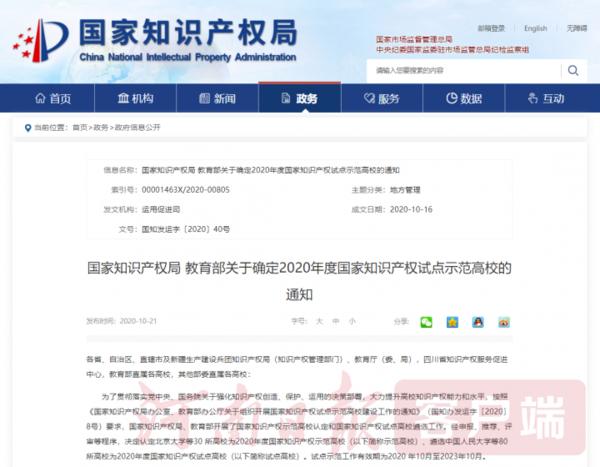 據(jù)悉,為貫徹落實(shí)黨中央、國(guó)務(wù)院關(guān)于強(qiáng)化知識(shí)產(chǎn)權(quán)創(chuàng)造、保護(hù)、運(yùn)用的決策部署,大力提升高校知識(shí)產(chǎn)權(quán)能力和水平,國(guó)家知識(shí)產(chǎn)權(quán)局、教育部開展了國(guó)家知識(shí)產(chǎn)權(quán)示范高校認(rèn)定和國(guó)家知識(shí)產(chǎn)權(quán)試點(diǎn)高校遴選工作。經(jīng)申報(bào)、推薦、評(píng)審等程序,共在全國(guó)遴選認(rèn)定北京大學(xué)等30所高校為2020年度國(guó)家知識(shí)產(chǎn)權(quán)示范高校、遴選中國(guó)人民大學(xué)等80所高校為2020年度國(guó)家知識(shí)產(chǎn)權(quán)試點(diǎn)高校(排名不分先后)。試點(diǎn)示范工作有效期為2020年10月至2023年10月。