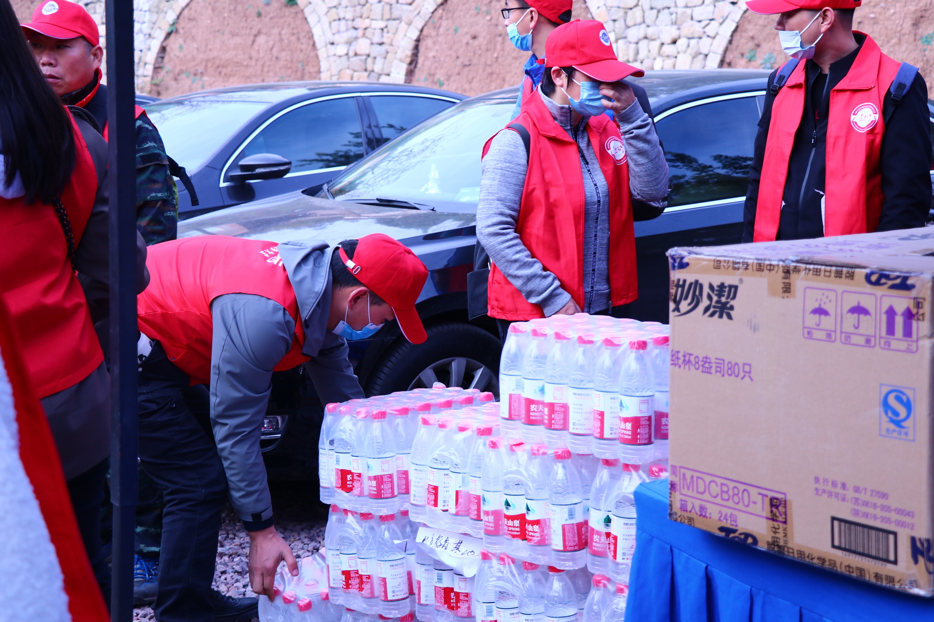 志愿者有序擺放補(bǔ)給物資