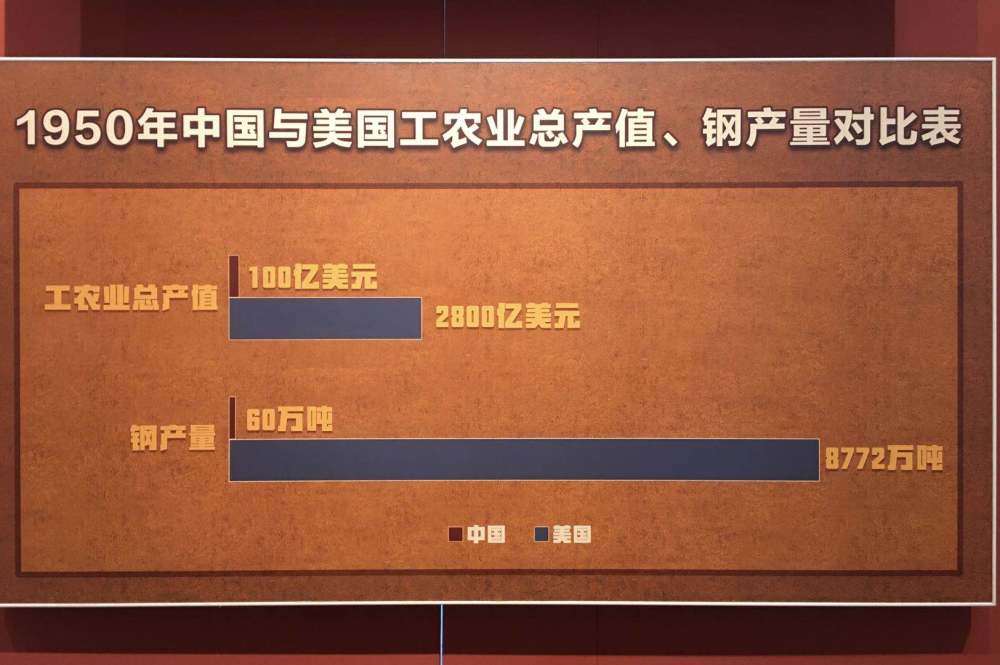 1950年,新中國的工農(nóng)業(yè)總產(chǎn)值僅為美國的1/28,鋼產(chǎn)量還不到美國的1/114。在武器裝備上,兩支軍隊(duì)更是天壤之別。