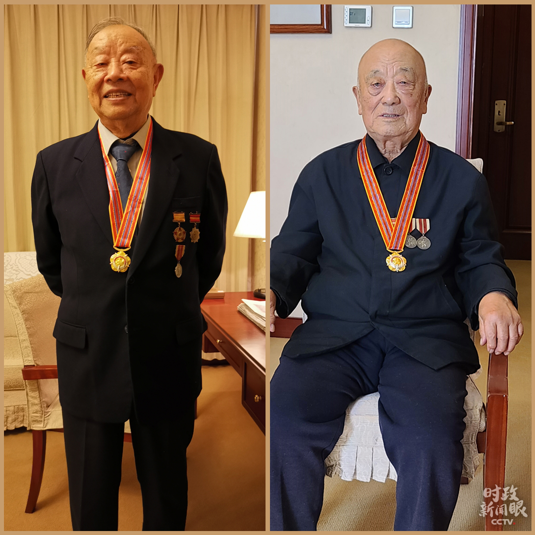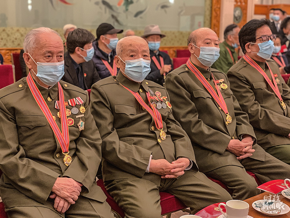 △今年86歲的張?jiān)?左)參加過(guò)上甘嶺戰(zhàn)役,榮獲三等功2次,90歲的王德啟(右)在抗美援朝期間榮立三等功4次。他們都出席了當(dāng)天的紀(jì)念大會(huì)。(總臺(tái)央視記者王曉東、趙化拍攝)