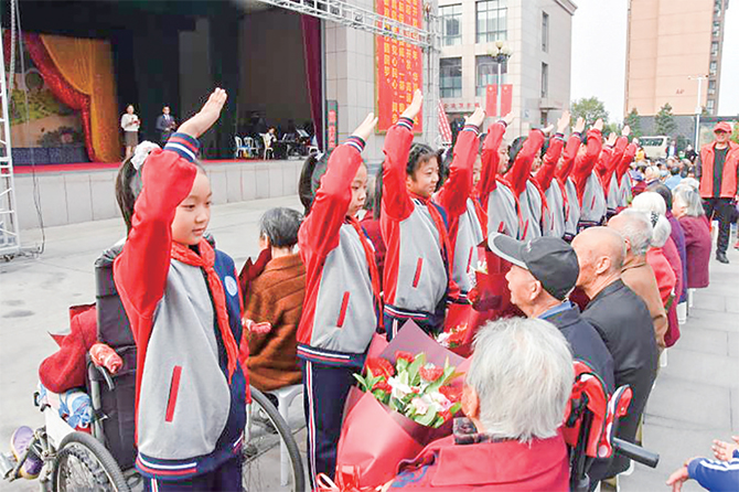 10月24日,在柿檳新村,學(xué)生正在為老人獻(xiàn)花。