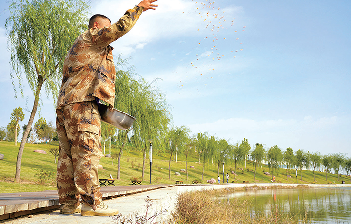 10月31日,在東湖,工作人員正在投放鳥(niǎo)類食物。