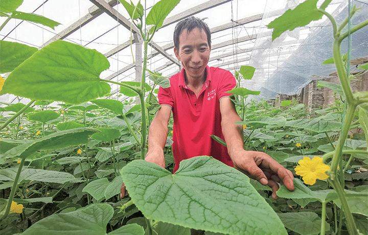 李建設(shè)在大棚里打理黃瓜