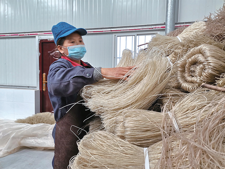 在紅薯加工廠打工的村民張?zhí)泼髡f:“現(xiàn)在是旺季,來加工粉條的群眾比較多,有時候需要加班到深夜才能完成訂單。紅薯一天的加工量近3萬斤,能產(chǎn)出2000余斤粉條。”