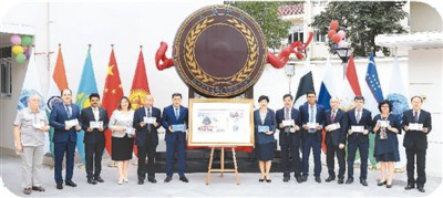 6月15日,上海合作組織睦鄰友好合作委員會與中華全國集郵聯(lián)合會共同發(fā)行公益紀(jì)念封700套。圖為嘉賓代表手持紀(jì)念封合影。新華社記者 李賀 攝