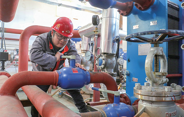 工作人員在供熱首站進行設(shè)備調(diào)試檢查