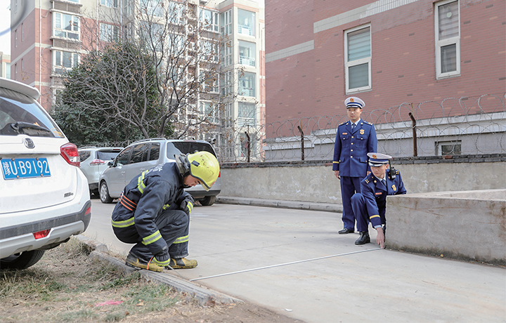 消防指戰(zhàn)員對消防通道寬度進(jìn)行實(shí)地測量