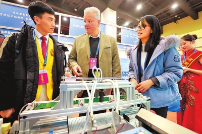 在鄭州舉行的2019年中國技能大賽決賽智能制造裝備與技術(shù)展上,蘇州一家信息咨詢公司的負(fù)責(zé)人在展臺前詢問。本報(bào)資料圖片