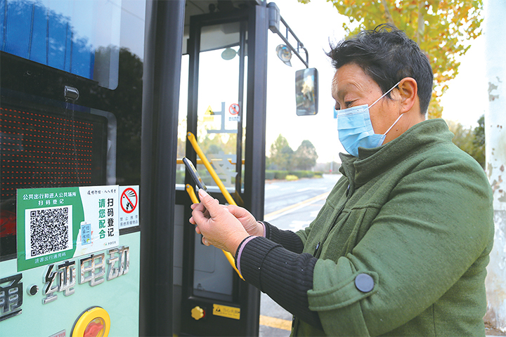 11月18日,市民戴口罩掃碼乘公交車。