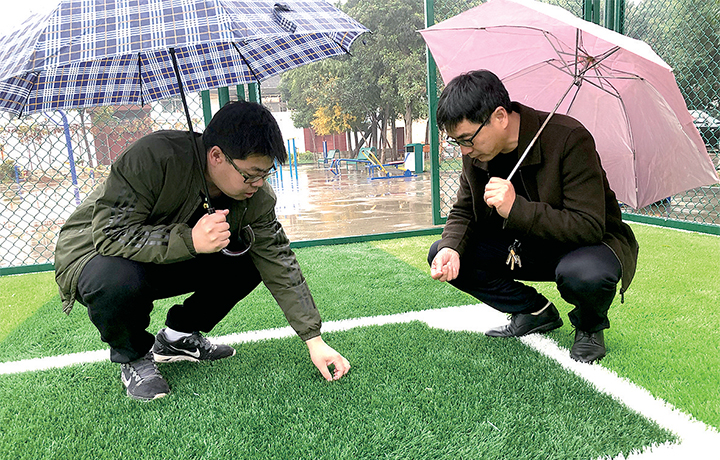 工作人員查看社會(huì)足球場(chǎng)的人工草坪情況