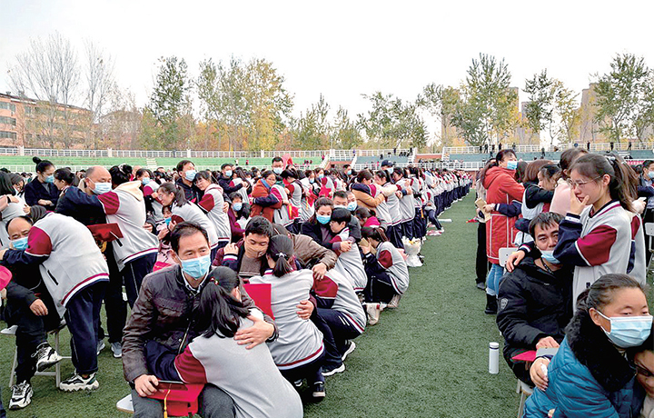 成人禮現(xiàn)場(chǎng),同學(xué)們將滿(mǎn)是感恩之情的信交給父母,父母也將自己飽含期望的信交到了孩子手中。他們暢訴心里話,互相擁抱?!捌綍r(shí)在家和父母溝通比較少,我想借此機(jī)會(huì)向爸爸媽媽敞開(kāi)心扉,表達(dá)心中的感謝之情。”高三(19)班學(xué)生郭夢(mèng)琳說(shuō),經(jīng)過(guò)莊重的宣誓儀式,心里多了一份責(zé)任,她要以?xún)?yōu)異的成績(jī)回報(bào)父母和老師的關(guān)愛(ài)。